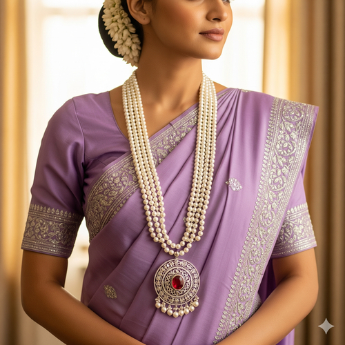 Lavender– Lavender is an another color which looks so pure and calm when paired with pearls. Also a silver color pendent looks more alluring with pearls when worn with a lavender color outfit.