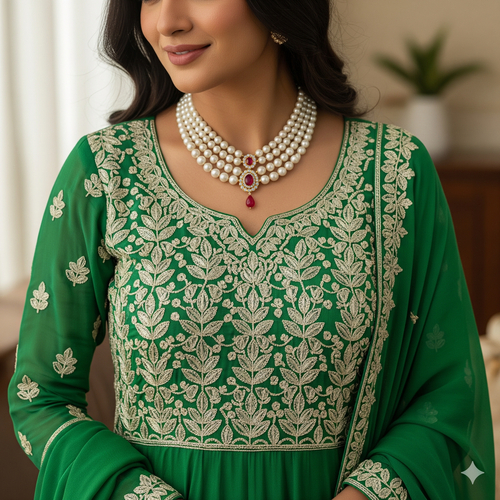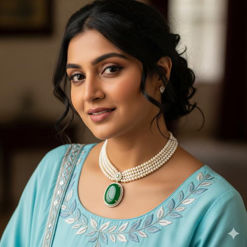 Salwar suit– You can also wear a multistring neckpiece with your traditional salwar suits, especially those which have chickankari work on them. The white stitch of the chickankari embroidery compliments the look of a pearl jewelry making it a perfect combination to try. If you don’t like the white look of pearls then go for the colored ones, which are light pink or the natural off white look. You can also choose for smaller and delicate pearls rather than the bigger ones.