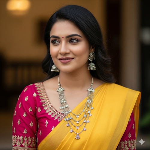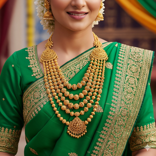Multilayer strings– A delicate multi layer neckpiece goes well with a plain silk saree. You can pick one in traditional gold color or the ones which are done with zerkins.
