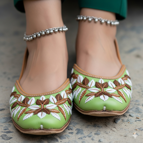 1. Embroidered juttis – Hand-stitched with threadwork, mirror work, or zardozi (gold/silver embroidery).