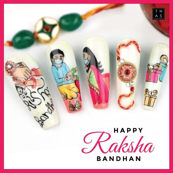 Go elaborate– You can also go a little elaborate on the design and ask your nail artist to create something as picture perfect as this one. Gifts, rakhi, love between brother and sister, festivity, well all these are essence of this festival.