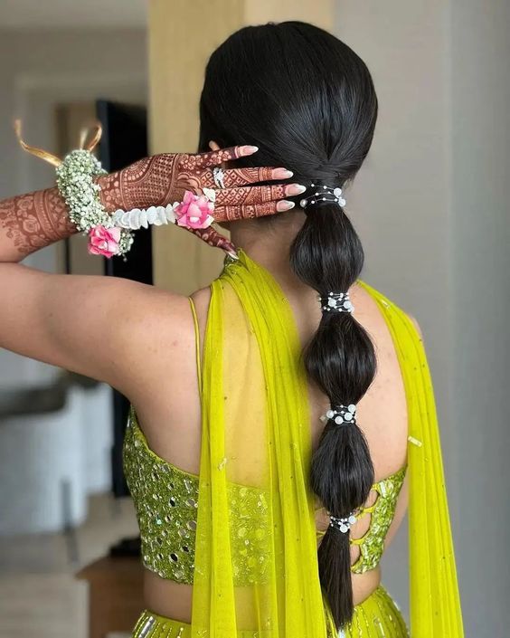Gajra– Nobody can say no to gajra right. The fragrance of the mogra flowers makes for the best highlighting accessory. So if you are wearing a traditional attire then you can definitely think of using mogra flowers or gajra strings to highlight the bubble braid.
