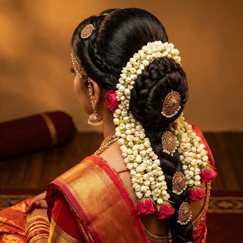 Fake bun look with back plait– Using gota lace for the plait is the latest trend in bridal fashion. So going for a double braid is a great option to adorn your hair with the gota laces. Using a lot of fresh flowers at the start of the braid will also give a fake bun look.
