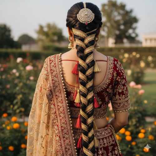 Gota motifs and tassels– You can also mix different gota motifs and tassels in different sizes and colors to highlight your braid. Do this in an all over pattern, or you can also choose to go light to dense just like in the picture.