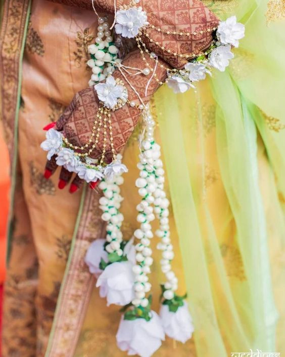 Floral Bracelet– Simple kaleerein looks even more interesting when accompanied by a floral bracelet. It is a complete set where real flower strings are attached to the floral bracelet.