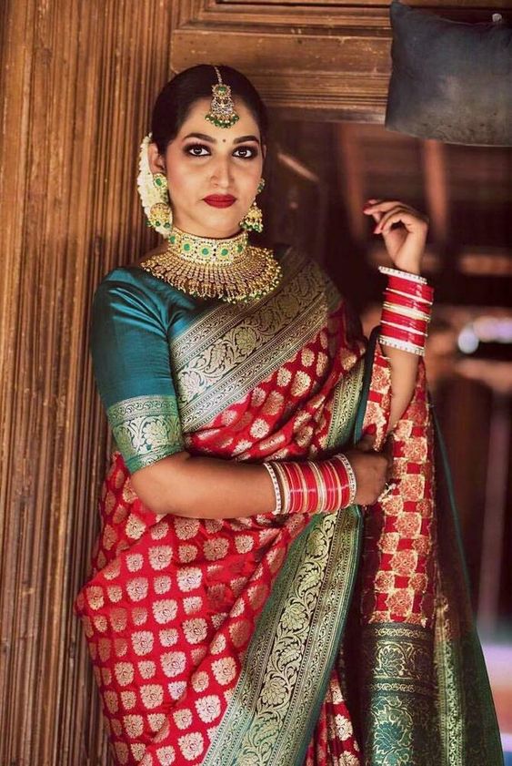 Red bridal saree– A Kanjeevaram or Banarsi saree is all what you need to flaunt that perfect traditional bridal look. A matching embroidered blouse done in a traditional style will give you a perfect desi Bollywood look. Smokey eyes and a big neck-piece will compliment the look.