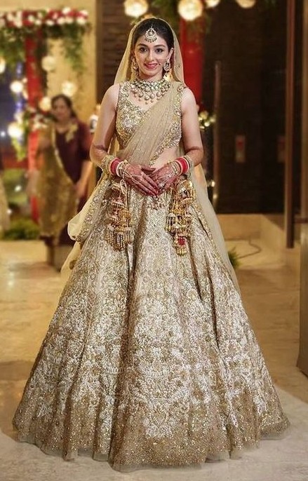 – If you are a modern bride, then an idea of wearing a sleeveless blouse with a traditional lehnga will be a good option for you. Take a single dupatta in a seedha palla style. Don’t forget to have the hands done in mehndi untill upper arm, as you are wearing a sleeveless cut.