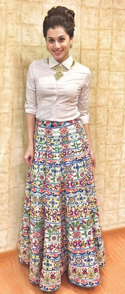 – Wear Plain classic collar shirt with a multicolor lehnga in white background. Lehngas with white background are apt to be teemed with a classic white shirt than any other color. It will also make you look taller because of its similar color. Team it up with a bold polki neck piece and earrings.