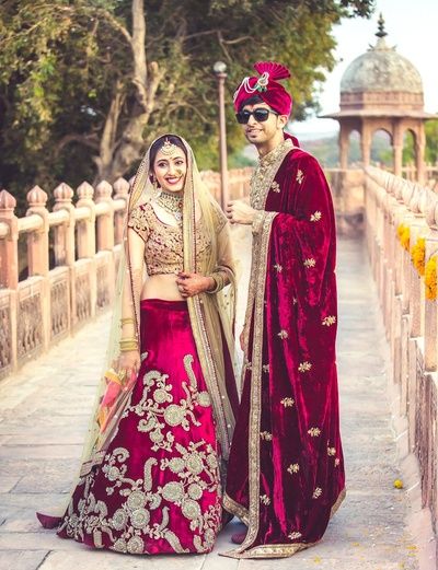 – Matching tints and shades of a color is a pretty good combination for couples. Choose a color which you like, and the bride can have the lehnga in a darker shade and the groom can have a Sherwani in a pastel color of the same shade.