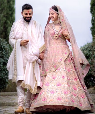 Anushka Sharma-The current example of Anushka wearing a beautiful powder pink lehnga with embroidered floral motifs for her wedding is a perfect example of this trend in fashion.