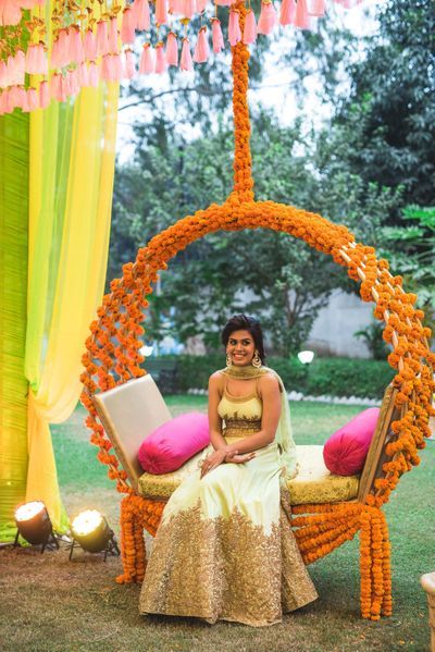 Marigold ring– A ring covered with all marigold flowers is the best idea if you are looking for a ring style decor especially for Haldi ceremony.