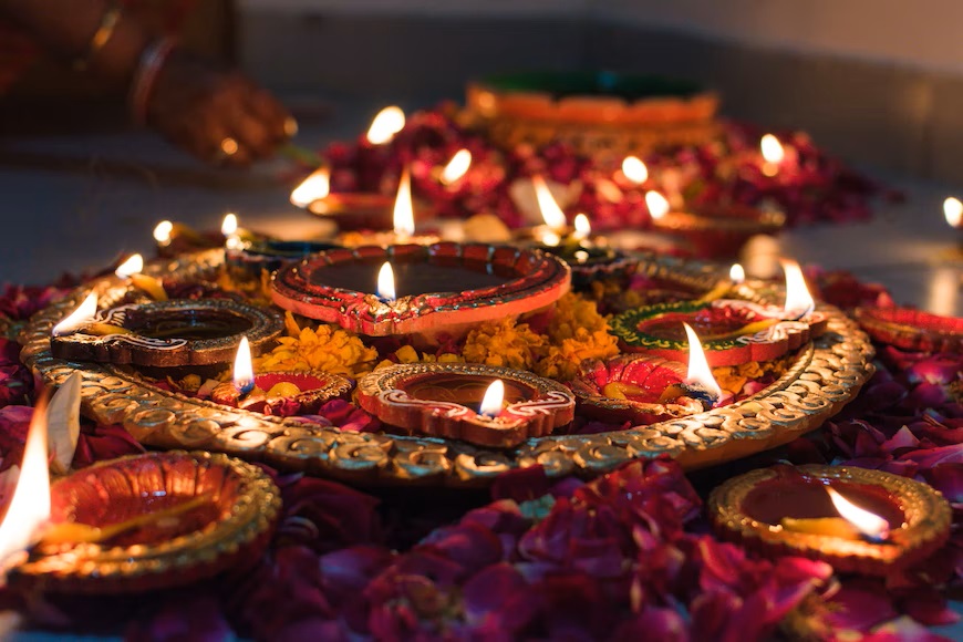 Mogra flowers– Using mogra flowers is considered auspicious and looked upon. The diya stand can be put in a tray fully decorated with mogra flowers, along with mogra flower hangings all over the corners. You can also use flowers matching with the shade of your attire for a customized look.