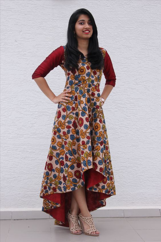 Mix and match– You can also use it as a patchwork for a plain dress or a kurta. A simple floor length anarkali can have a broad contrast hemline in kalamkari like this one.