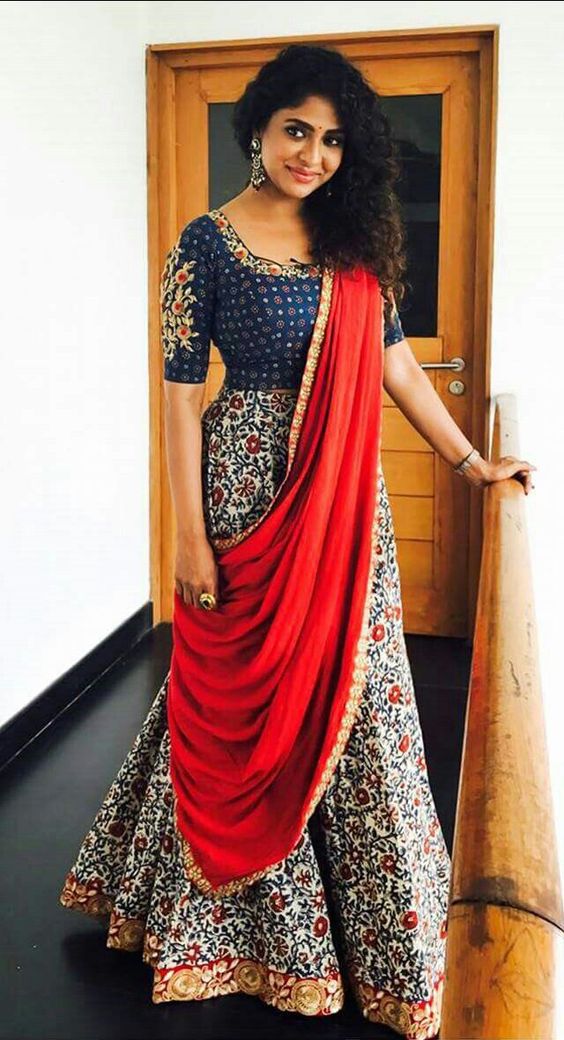 Lehnga– When it comes to ethnic wear then why not opt for traditional fabrics. A simple lehnga or a skirt in kalamkari with a nice border looks flattering. The blouse can be done in a contrast fabric with nice embroidery in gold and resham. Pick up a contrast shade dupatta and the set is ready.