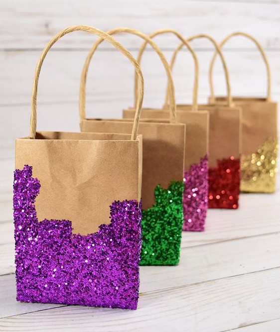 Glitter bags– These cute glitter dip bags are great for birthday, cocktail and even for baby shower parties. Just select the pattern you want and use a lot of glue over that pattern.