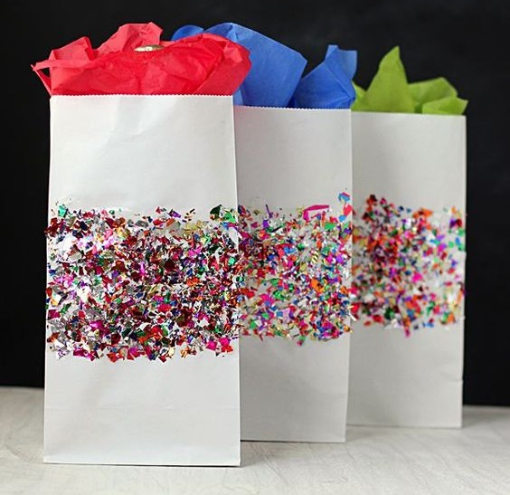 Colorful confetti– Confetti are small pieces or streamers of paper, mylar, or metallic material which are usually thrown at celebrations, especially parades and weddings. You can simply cut out tiny pieces in different shapes and sizes and use it to decorate the bags.