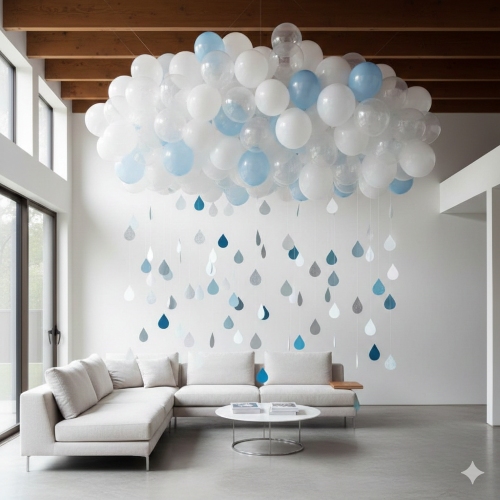 Balloon Cloud– Bunch of Balloons tied up in a form of cloud and paper raindrops falling can be a center of attraction for ceilings, window display.