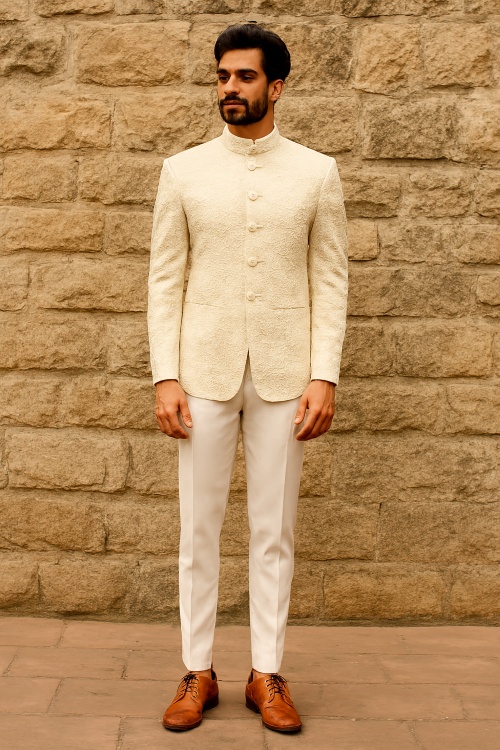 - Mandarin collar (Bandhgala) – The defining feature, giving a regal and sophisticated look.