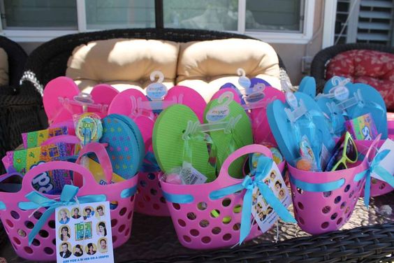 Pool party– A basket with colorful flip flops, bubbles, towels is a great idea if you are throwing a pool party for the kid.