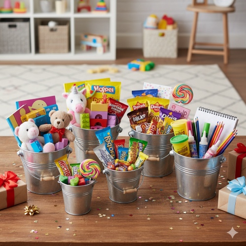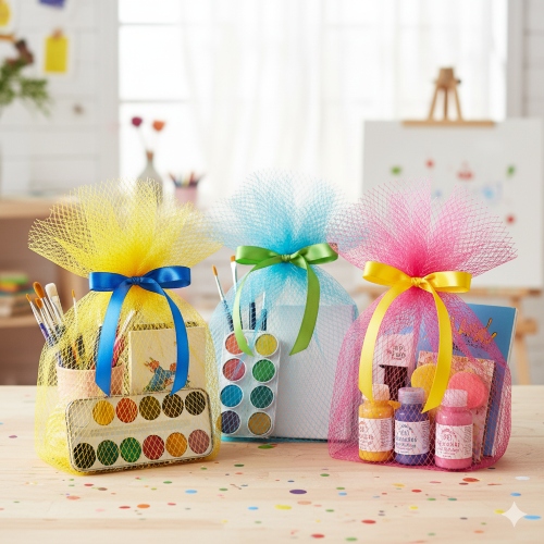 The bucket idea– Small cute buckets can serve as a good packaging base for arranging assorted items for kids. Fill the bucket with the things of your choice like some eatables in a small tiffin box, few small games like bubbles, a small doll or a batman. Finally cover and seal the full arrangement with a net fabric and ribbons so that everything remains at place.