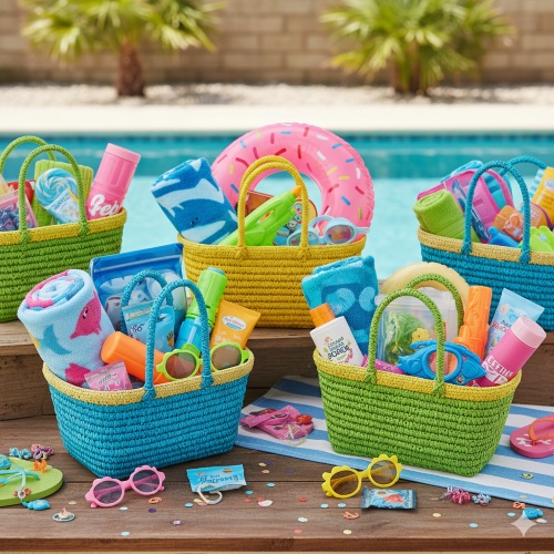 Pool party– A basket with colorful flip flops, bubbles, towels is a great idea if you are throwing a pool party for the kid.