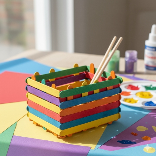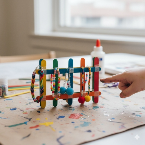 Jewelry stand– If you are wondering how to display your jewelry, then here is an idea. Create a criss cross pattern with the colored sticks and use it as a earring stand. You can create a bigger stand for this too.
