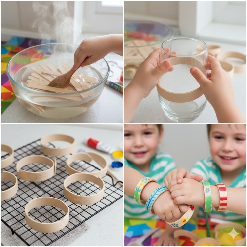 Bracelets– Interesting project for baby girls, this is super easy if you set it right. Place sticks in hot water and take it out after some time. Now try to bend them slightly and without breaking them place them inside a clean jar or a cup. Let them dry completely in the sun or in a dry place. Once its done, you can paint them in different colors and patterns to match your dresses.