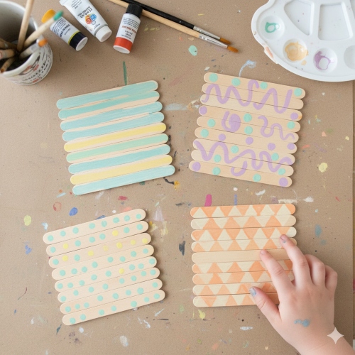 Coaster– Create different patterns on sticks with a marker or sketch pen, it can be in single color or you can choose different colors too to do this. Place 3 sticks parallel to each other, this will act as a base for making the upper main portion. Now start sticking the patterned sticks in the opposite direction. Let it dry completely before use. Your coasters are ready.