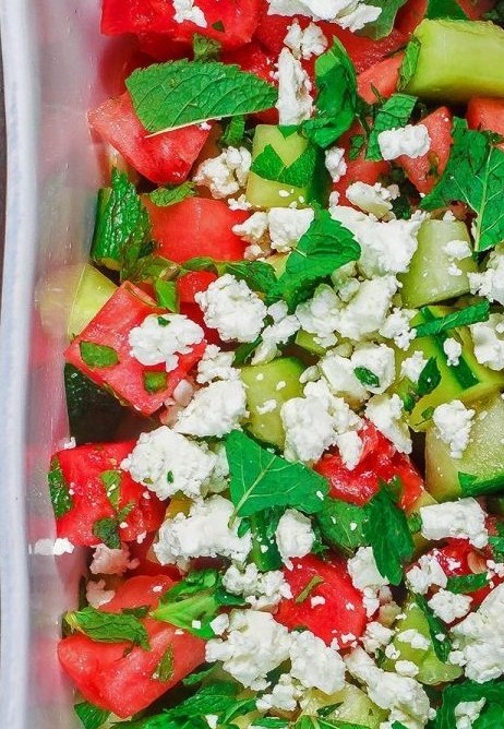 A watermelon salad is anytime better than munching on a unhealthy snack.