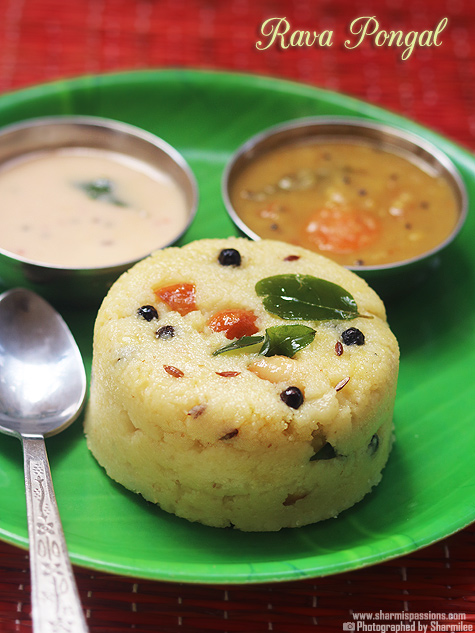 Rava Pongal– Take 3tbsp of moong dal and roast it slightly on a low flame till it becomes aromatic. Rinse it properly and pressure cook it with some salt. Now heat a pan and dry roast 1/2 cup rava or sooji till it becomes aromatic. Take it in a plate and in the same pan heat some ghee and add cumin seeds, cashew, curry leaves, chopped ginger and crushed black pepper and fry slightly. To this mix pour water and bring it to boil, once the water starts boiling lower the flame and add rava while stirring it continuously with another hand. This step is necessary to make sure that there are no lumps while adding the rava. Now add cooked moong dal and cook until rava is cooked properly. Serve with chutney and pickle.