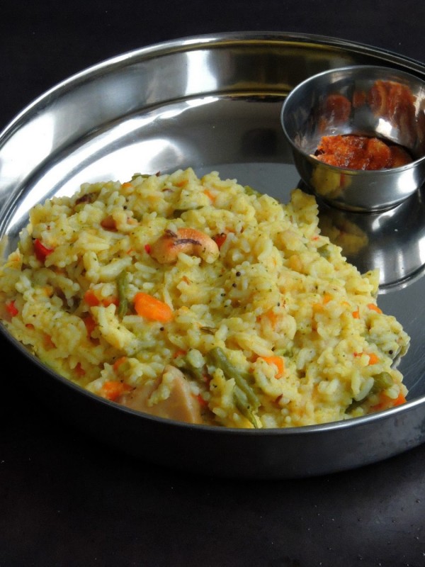 Simple Pongal– Dry roast 1/4th cup moong dal till it turns aromatic and switch off the flame. Then mix 1/2 cup rice in it and rinse properly. In a pressure cooker take this rice and dal mix and add 1/2tsp cumin seeds, hing according to taste, 1tsp chopped ginger and salt and water for cooking. Cook on medium to high flame till 9-10 whistles. The consistency should be like a khichri or you can even mash the mix slightly once cooked. To prepare the tempering take another pan and add 2-3 tsp ghee to it, to this add cumin seeds, cashew pieces, black pepper and curry leaves and fry them till they become crisp. Pour this tempering over the pongal and serve hot with coconut chutney or sambar. For the vegetable version or vegetable pongal you can add veggies of your choice to the dal and rice mix.