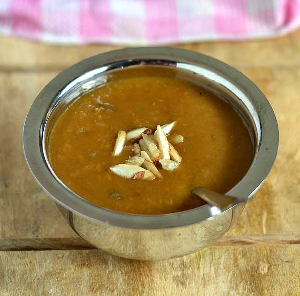 Sweet Patato Payasam– Peel and cut 2 sweet potato, now add a tsp of ghee in a pressure cooker and put 1/4th cup moong dal and roast it for 2-3 minutes.