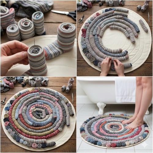 Create a floor mat– Since they soak water easily, this can be an apt use of the bundle of lost socks which are lying in your cupboard. Place them in a zig zag manner over a base of a plain mat and it can be a great thing for bathing rooms.