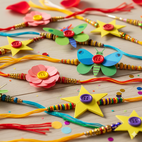 Button it up– Buttons in different shapes look impressive on a Rakhi made for kids. You can make cloth or felt rakhis and pick up interesting shapes of fruits, stars, butterfly etc, basically shapes which kids would love to see on their hands, and use a colorful button at the top to keep the layers intact. Buttons in figures like parrot, peacock etc. look interesting too.