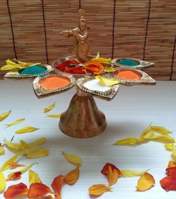 Use a diya stand– Diya stand can be used to keep colors. You can also place a god or goddess idol at the center and sprinkle a few flower petals all around.