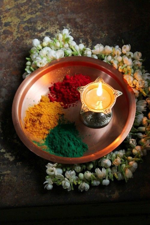 Add a divine touch– Use a lighted diya with the colors in the plate, and do use mogra flower strings around the plate for natural fragrance.