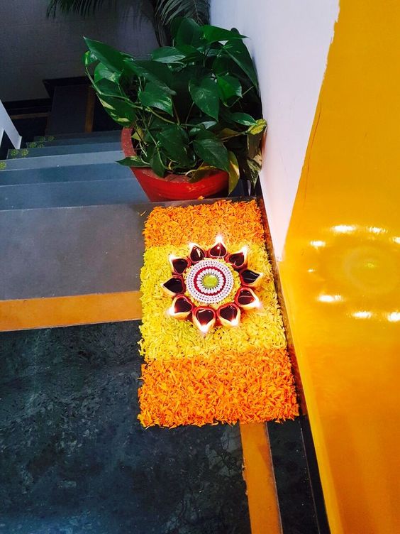 Table top decor– Though this Rangoli is done on floor but you can make something like this on a table top. Your serving tray can be used in the middle and use flower petals in different colors to create a simple border. In this tray you can keep different eatables to serve your guests . Or just use it for decorative purpose by placing a few lights and lamps.
