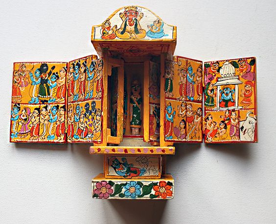 Mewar the home of this art has been producing these stories for at least 400 years. The stories are told in the form of hand paintings which are done over brightly colored wooden boxes. These wooden boxes are interlinked to each other and open and close just like a puzzle. Neem wood is often used to create wooden boxes for this art as neem wood hardly rottens, making the artwork to survive through ages. Though semal and mango wood is also used.