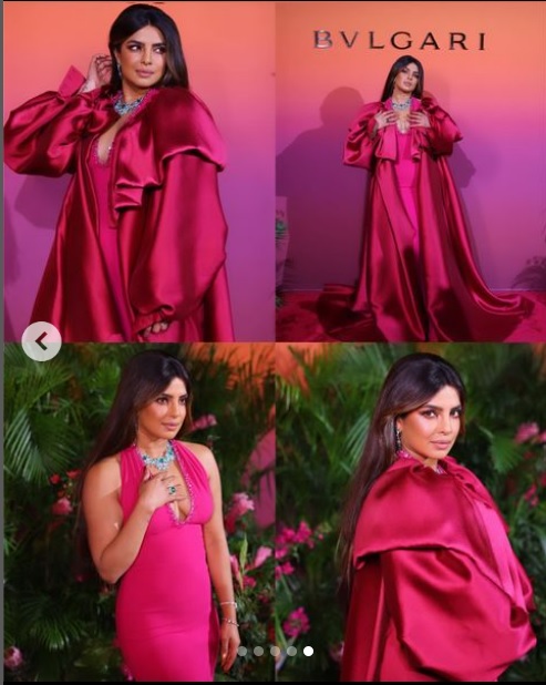 Priyanka Chopra recently attended an evening celebrating Bulgari’s Eden, The Garden of Wonders collection in Dubai. The actress who is global brand ambassador of Bulgari stunned everyone in a wine color fitted dress which she wore with a flowy satin cape. She accessorized her look with a stunning Bulgari neckpiece and kept the makeup minimalist.