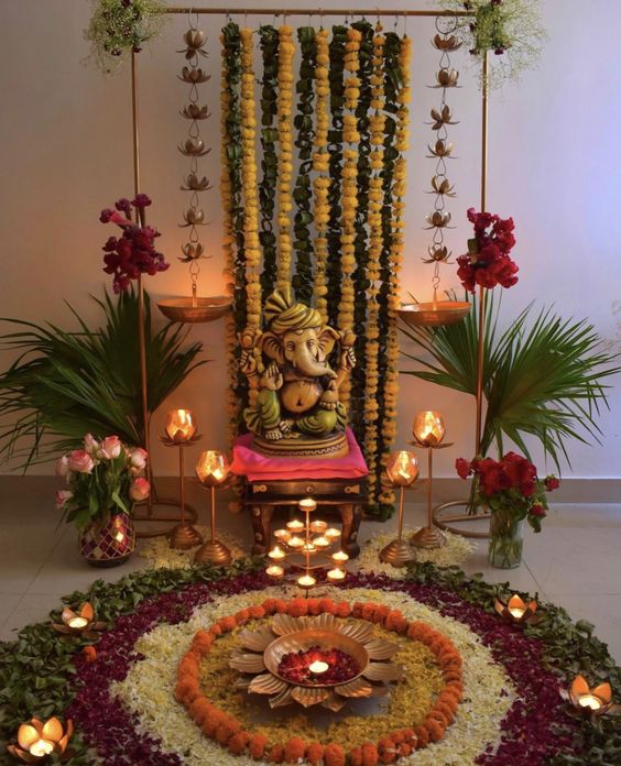 Make your own little space– Create a cosy space for yourself where you can sit quietly and enjoy the festivity and the ambience around you. You can add ganpati idol on a raised platform and use lamps and diya’s all around the rangoli beneath the idol.