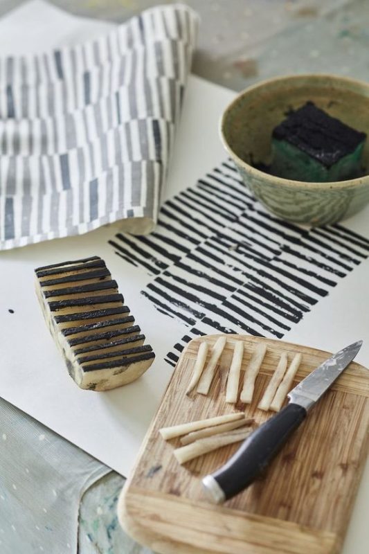 Simple lines– For this design you will have to choose a long potato so that you are able to block more lines in one go while stamping.