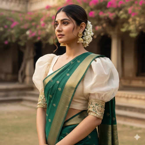 Puff sleeves add a very feminine touch to any design. And when you want to give your traditional saree blouse a bit of a modern twist then this kind of sleeves is great to go for. They can be done in various lengths, but the most common length which suits every body type and design is a half sleeve length. So this summer do try a puff sleeve blouse with your saree’s.