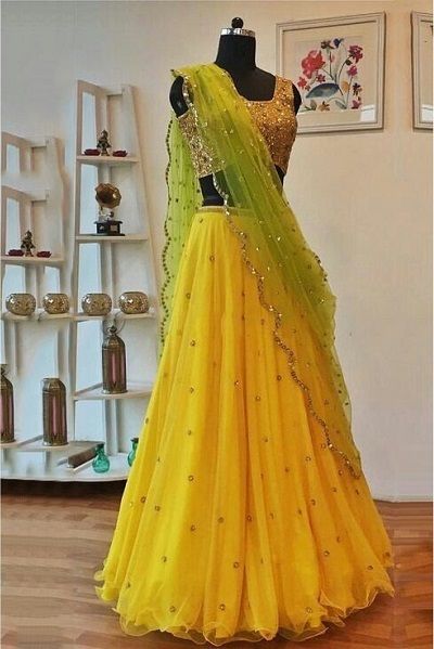 Pastel lehnga‘s have their own charm. They look super feminine and ultra girlish. And if you are a fan of pastel shade lehnga’s, then you would definitely want to keep one set for your wedding function. Pastel shade lehnga’s are perfect for day weddings which let you embrace all the lively color combinations. Here are a few color combinations to try with a pastel yellow shade….