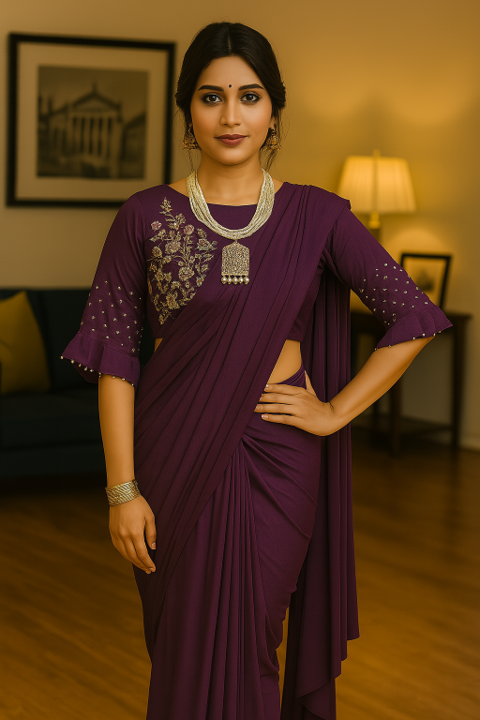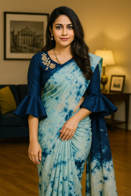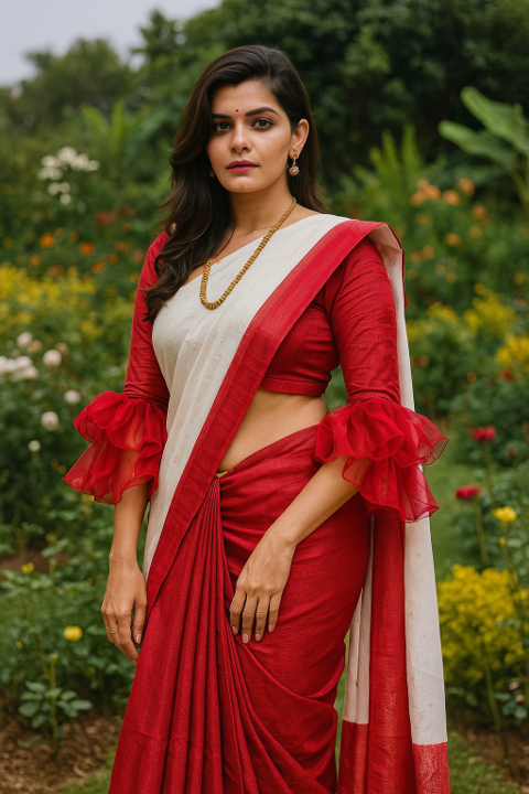 Try it on Off shoulder– You can go for full flare bell sleeves with an off shoulder blouse to add a contemporary touch to your saree.