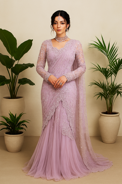Satin Net Saree and blouse – both made from net and satin fabric embellished with beads, cutdana and sequins pastel purple beads