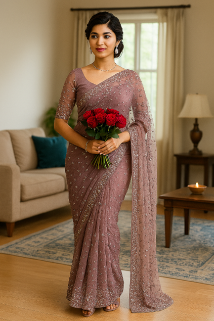 - Embroidered net sarees with sequins, zari, or beadwork add glamour.