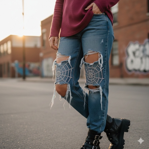Cutout motifs– Now you can either do this at home or take help of a professional embroider in your locality. The trick is simple, simply trace a motif at the knee area and cut it out with the help of the scissor. Be careful not to cut the back of the jeans while doing so. Now with the help of the needle and embroidery thread you can easily seal the edges of the cutout with a blanket stitch. Or you can also ask a local embroider to seal the edges with the machine embroidery.