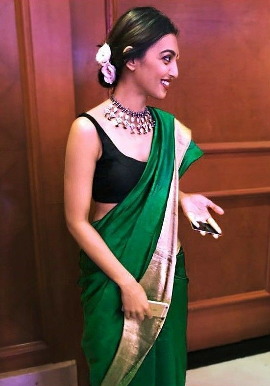 Satin sarees– Plain satin saree’s are so much in fashion, well its very easy to look gorgeous by teaming these saree’s with a sleeveless black blouse.