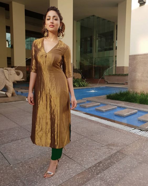 Straight kurta with contrast bottom– A well fitted long length lurex kurta will definitely look simply gorgeous. The fabric itself is so rich that you don’t have to put other embellishments to beautify it. Match it up with striking contrast color pants, and don’t forget to wear statement earrings. Now when you wear something which is so striking then you have to choose your footwear wisely. Go for a nude or the same metallic shade footwear in sleek style.