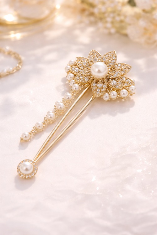 - Pearl And Gold Floral Hair Claws – So, you thought, that these just keep the hair manageable and off your face? Naah…These so much more. This goes well with traditional gowns and lehengas, too. Wear your hair into a chignon and add these for glam and sparkle.